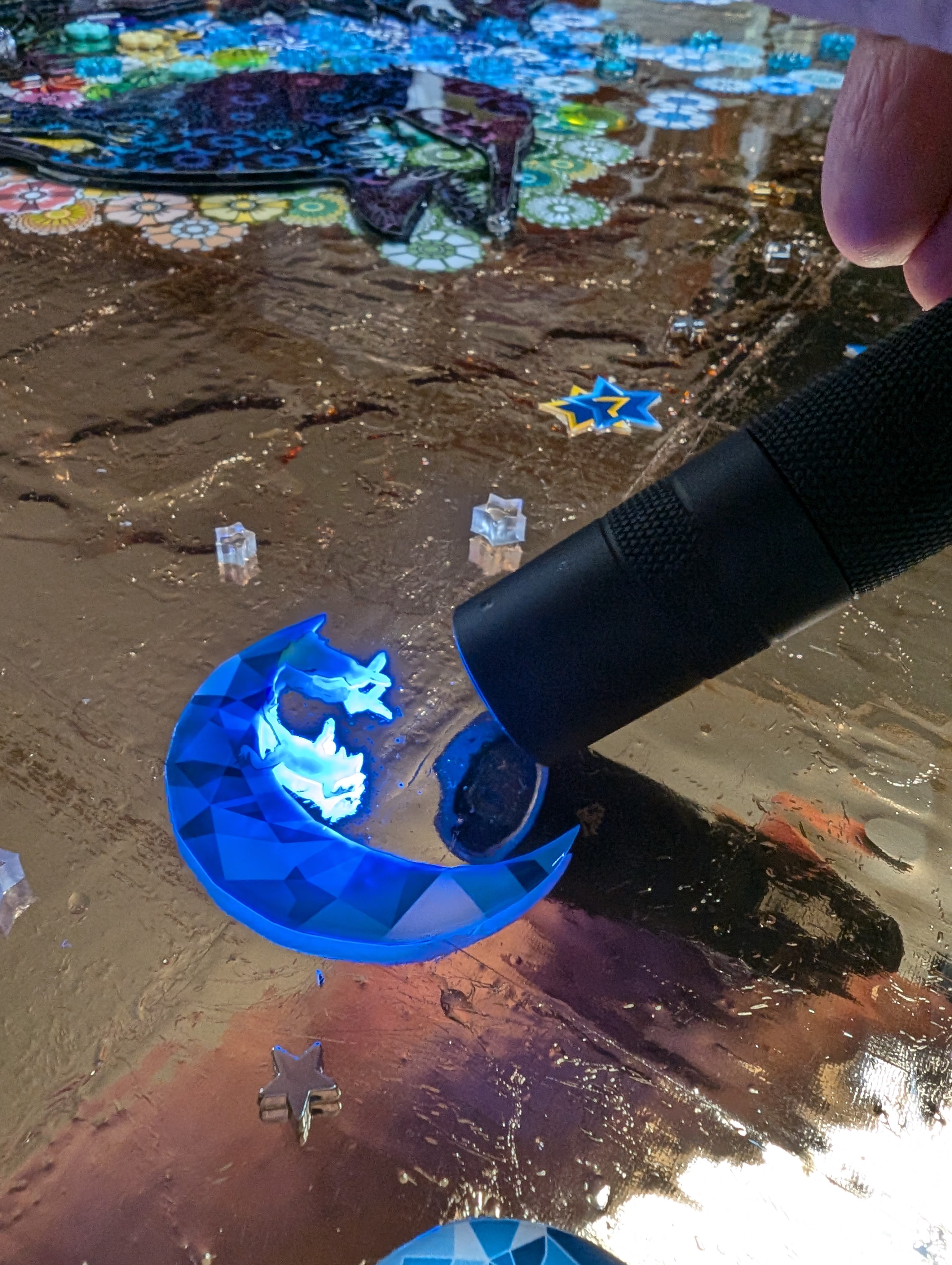 光を通す透明樹脂や、光を集めるラメやラインストーンが散りばめられ、生き物の多様性を保つ理想郷のように、
